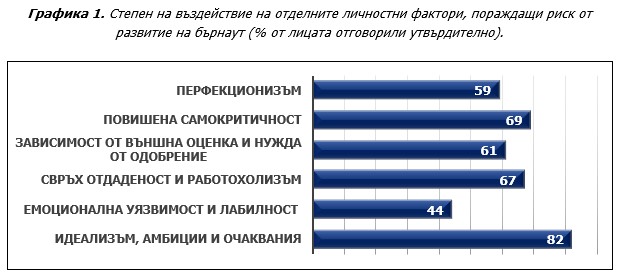 Данните показват, че в изследваните лица доминират три индивидуални черти, които са ключова предпоставка за професионално прегаряне. Те са свързани със завишените амбиции и очаквания, болезнената самокритичност и работохолизма. Около 60% от респондентите проявяват изострена зависимост от външна оценка (нужда от одобрение) и стремеж към перфекционизъм в работата си. Почти всеки втори споделя, че се чувства емоционално уязвим и трудно преодолява негативните преживявания в работната среда. Тези личностни качества могат да бъдат позитивни, когато водят до успех, но и деградивни (саморазрушителни), когато се натъкнат на постоянни и/или непреодолими проблеми и препятствия в работната среда. В такава ситуация те предизвикват дисбаланс в психичното състояние, разочарование, неувереност, напрежение и тревожност, които са в основата на хроничния стрес и синдрома бърнаут.