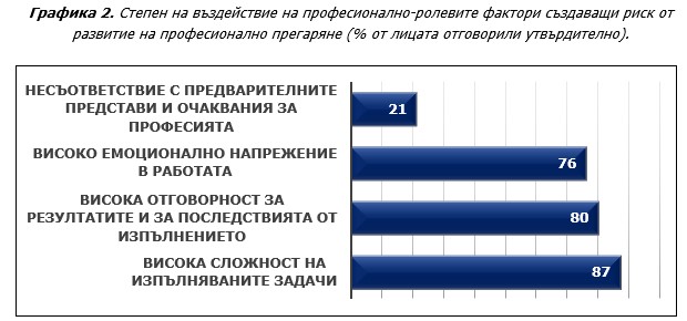Резултатите от проучването (Графика 2) показват, че изследваните лица определят като най-напрягащи три фактора, характеризиращи техните професионални роли и отговорности. Те са свързани с нарастващата сложност и мултифункционалност на задачите, високата отговорност в изпълнението и рисковете от грешки и проблеми, водещи до тежки последствия за организацията, както и работата в емоционално напрегнати ситуации. Всеки пети от изследваните лица споделя, че задачите, които изпълнява на работното си място не съответстват на предварителните му представи за същността на професията.