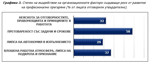 От данните на Графика 3 е видно, че претовареността е най-високият източник на напрежение и стрес в работата. Всеки втори от изследваните лица изпитва преумора и счита, че сроковете и количеството работа, която трябва да извърши, надхвърлят времето, с което разполага. Претовареността е свързана с натиска за постигане на резултати без реалистично прогнозиране и планиране, нереалните срокове, непредвидените и спешни задачи, необезпечените ресурси за изпълнение, неефективната организация, полагането на извънреден труд и др. неблагоприятни фактори в работната среда. Другият висок източник на напрежение и стрес са влошената работна атмосфера, конфликтите, липсата на открита комуникация, недостатъчната подкрепа от ръководителите и колегите, както и липсата на справедлива оценка, възнаграждение и признание за положените усилия. Всеки трети от изследваните лица твърди, че няма ясен регламент за неговите правомощия, често е принуден да изпълнява противоречиви изисквания и не разполага с достатъчно автономия и свобода в организацията на работата си.