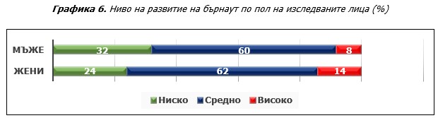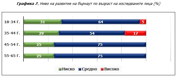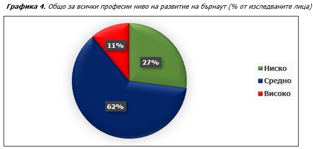 Обобщените резултати (Графика 4) за нивото на развитие на бърнаут в професиите, обхванати в изследването, показват тревожна картина. Засегнати от синдрома на професионално прегаряне са преобладаващата част от изследваните лица, като 62% са на средно ниво и 11% на високо ниво на развитие на бърнаут.