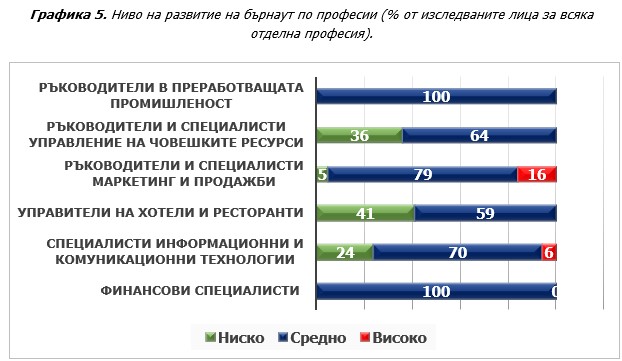 Синдрома на прегаряне се развива най-интензивно (Графика 5) в професионалните групи ръководители и специалисти маркетинг и продажби и специалисти информационни и комуникационни технологии. Във всички останали професии, включени в изследването, бърнаут е изразен преобладаващо в средна степен, която се характеризира с ясно проявен хроничен стрес в работата и прогресивно нарастващи емоционални, поведенчески, когнитивни, физиологични и социални симптоми на прегаряне. На лице е възходящ процес на емоционално и физическо изтощение, умствена преумора, намалена трудова ефективност, постепенна загуба на сили, енергия и мотивация. Този процес може да нарасне лавинообразно и да се навлезе в трето ниво на професионално прегаряне - състояние на психиката, при което настъпва пълен срив в адаптацията и в способността на индивида да се ангажира нормално и пълноценно с работата си.